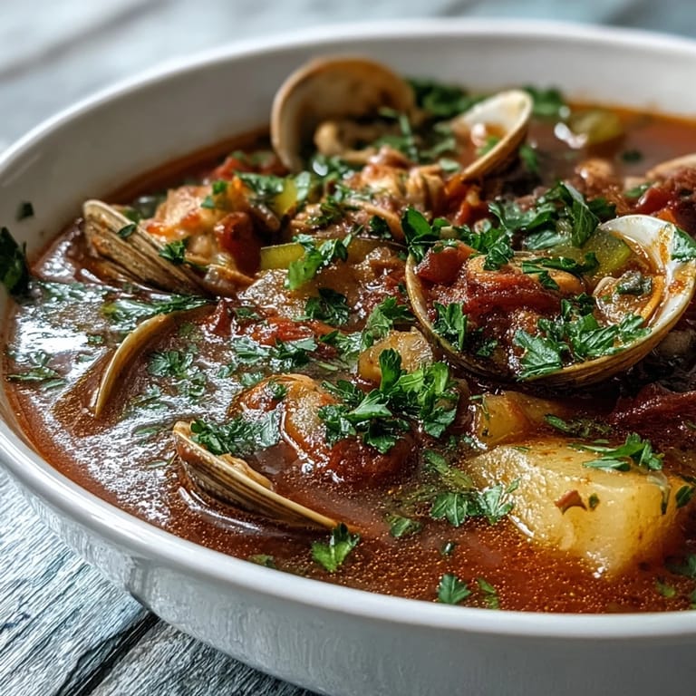 Save to Pinterest My neighbor stopped by one October afternoon with a bag of littleneck clams from the farmers market, and something about their briny smell made me want to cook them immediately. I'd grown up with New England clam chowder—the creamy, potato-heavy kind—but these clams felt like they deserved something brighter, something that would let their flavor sing instead of drowning them in cream. Within an hour, I'd built this Manhattan version from memory and a bit of intuition, and when she tasted it, she closed her eyes and said it tasted like the ocean decided to visit our kitchen.