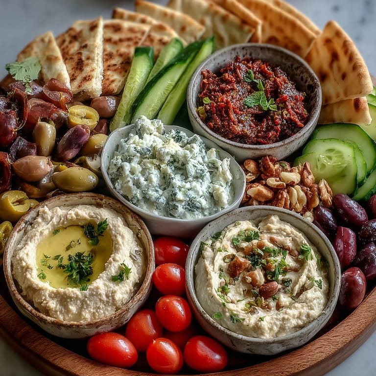 The first time I made this for a group, I watched people hover around the board, building their perfect bite, debating whether feta belongs on hummus or tzatziki. One friend layered cucumber, baba ganoush, and a walnut on pita and declared it life-changing. I realized then that the magic wasn't in any single element but in how the platter invited people to play, taste, and linger together.